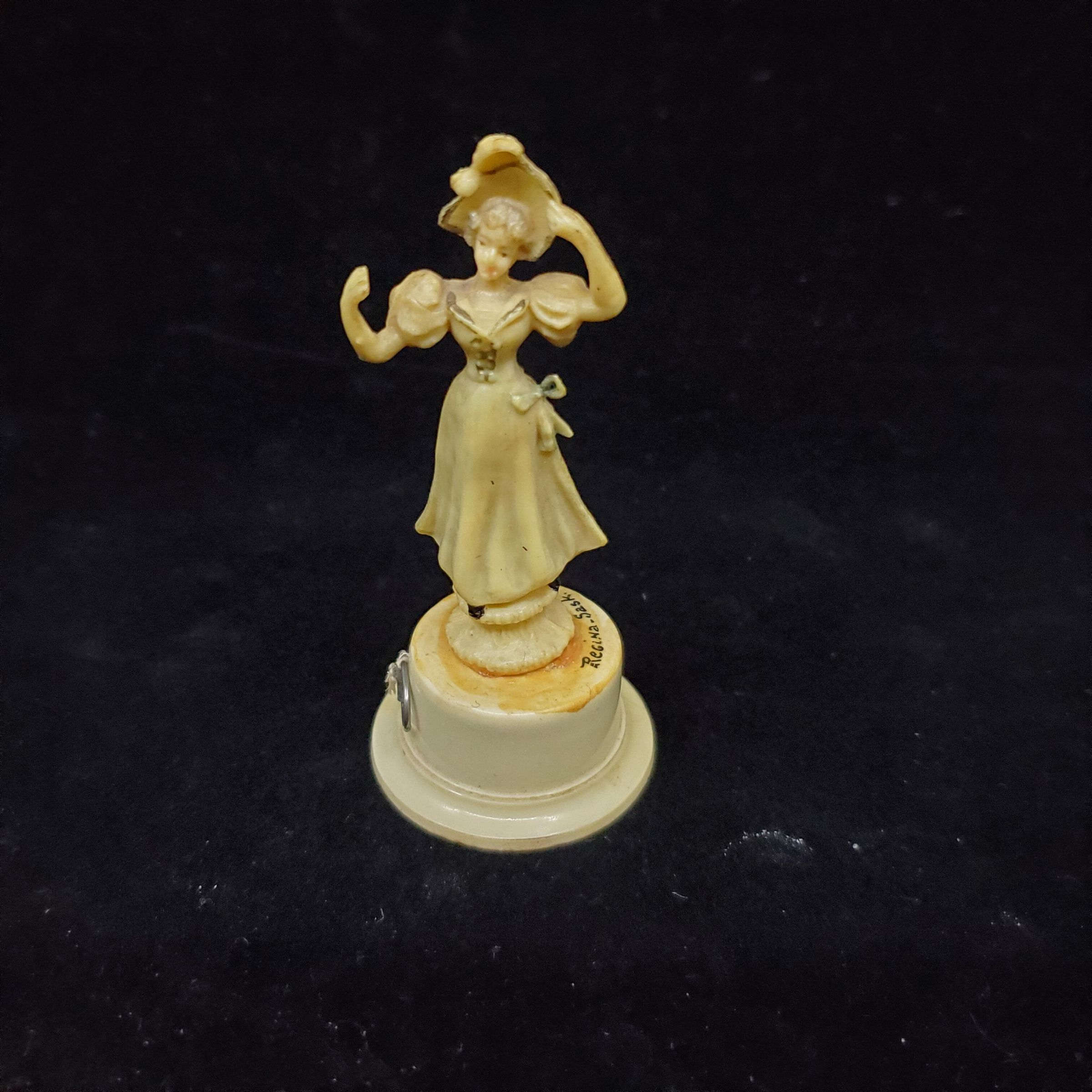 French ivory or celluloid, tape measure. Ivory colour round base with fluted rim. On top of base is figure of a lady with flared skirt which looks like it might have been green, and she is wearing a wide brimmed hat . Hand holding hat on. Stamped Regina, Sask. on base. Cloth tape, metal end.Souvenir.