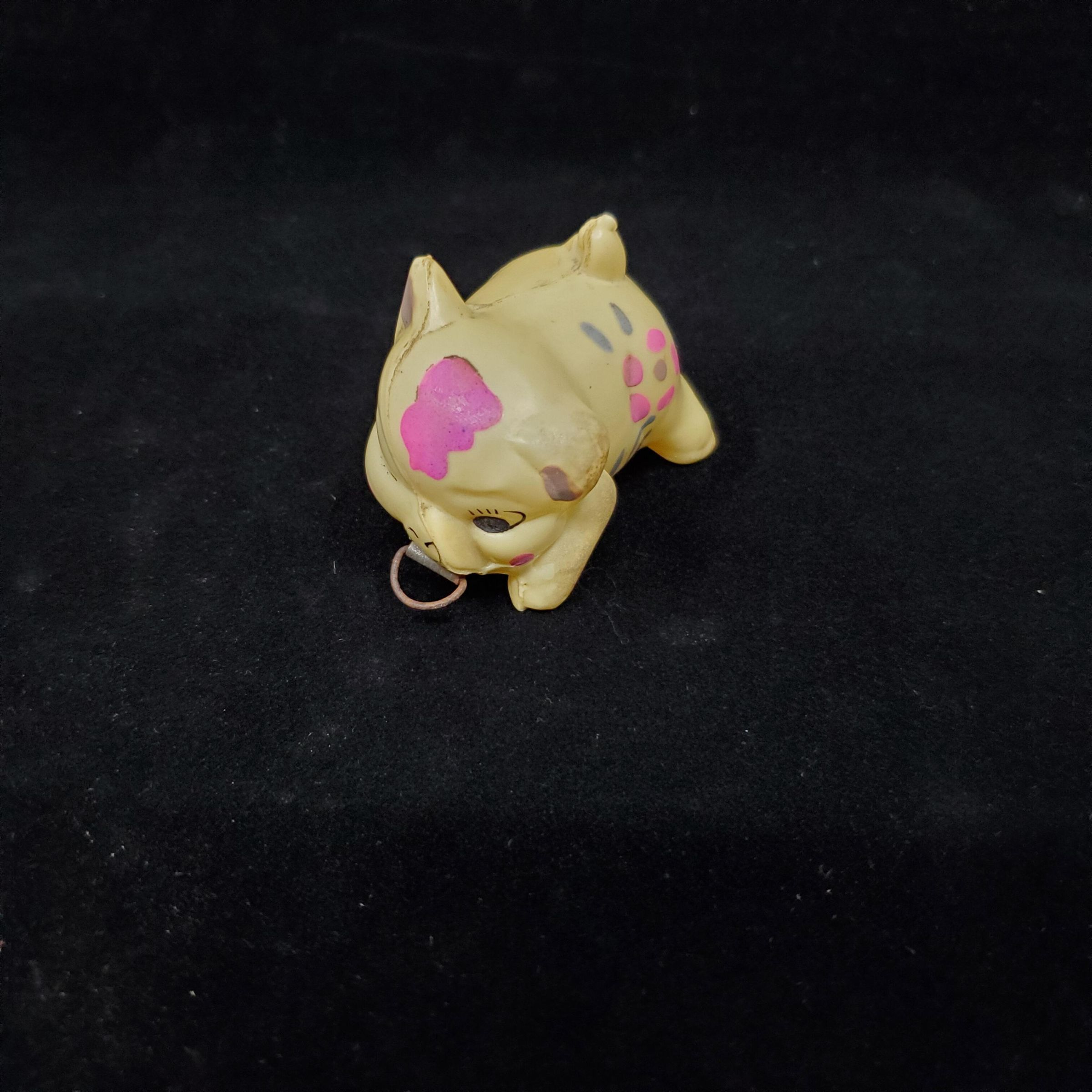 Celluloid tape measure in shape of pig. Flowers - red, with green leaves painted on pig. Cloth tape with steel end comes out of mouth, springs back. No marks.
