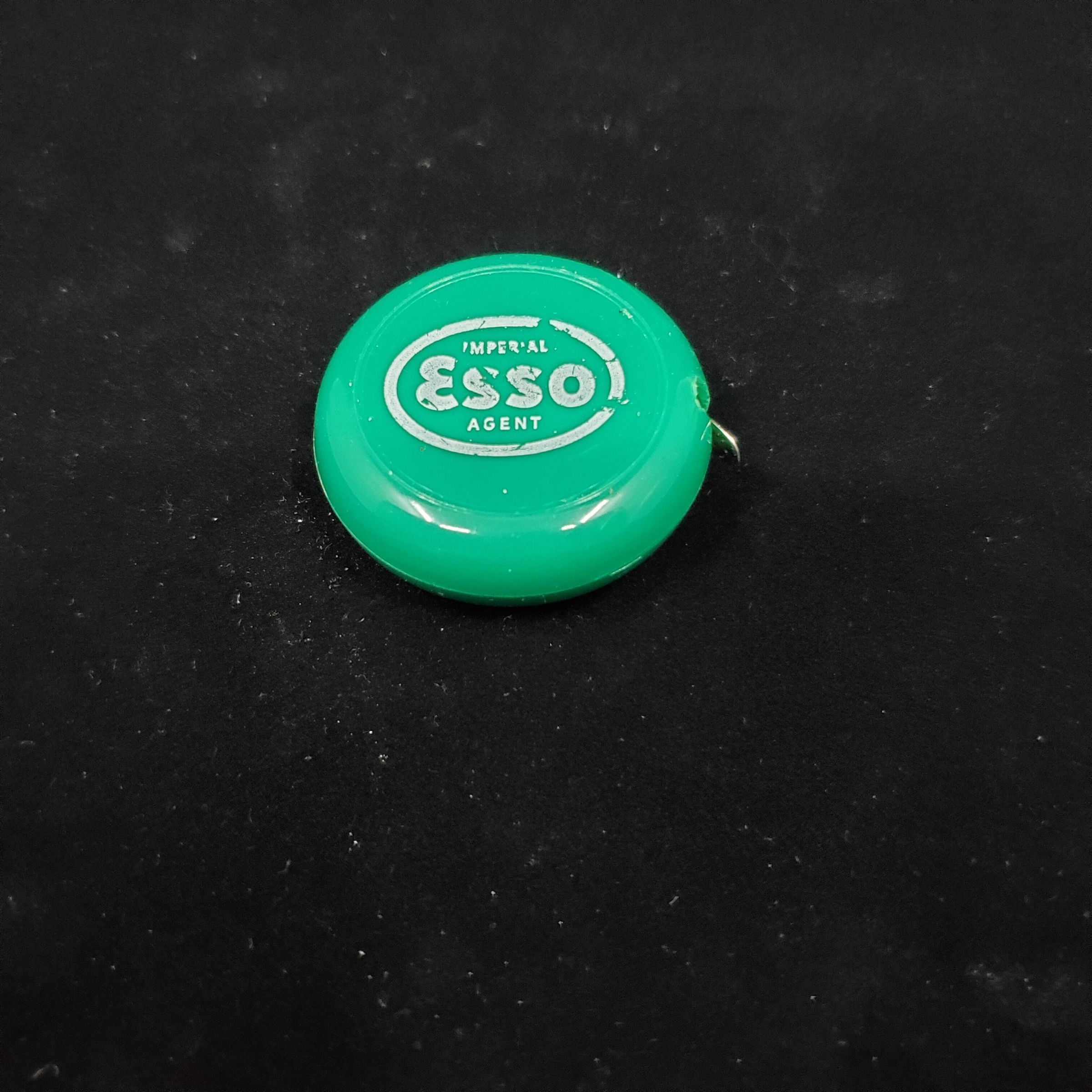 Advertising tape measure. Green plastic case with white printing. Advertising top side ÒImperial Esso AgentÓ; bottom side ÒJ.D.Brown Imperial Esso Agent Phone 20 Doeville, Sask.ÓSteel tape and end.