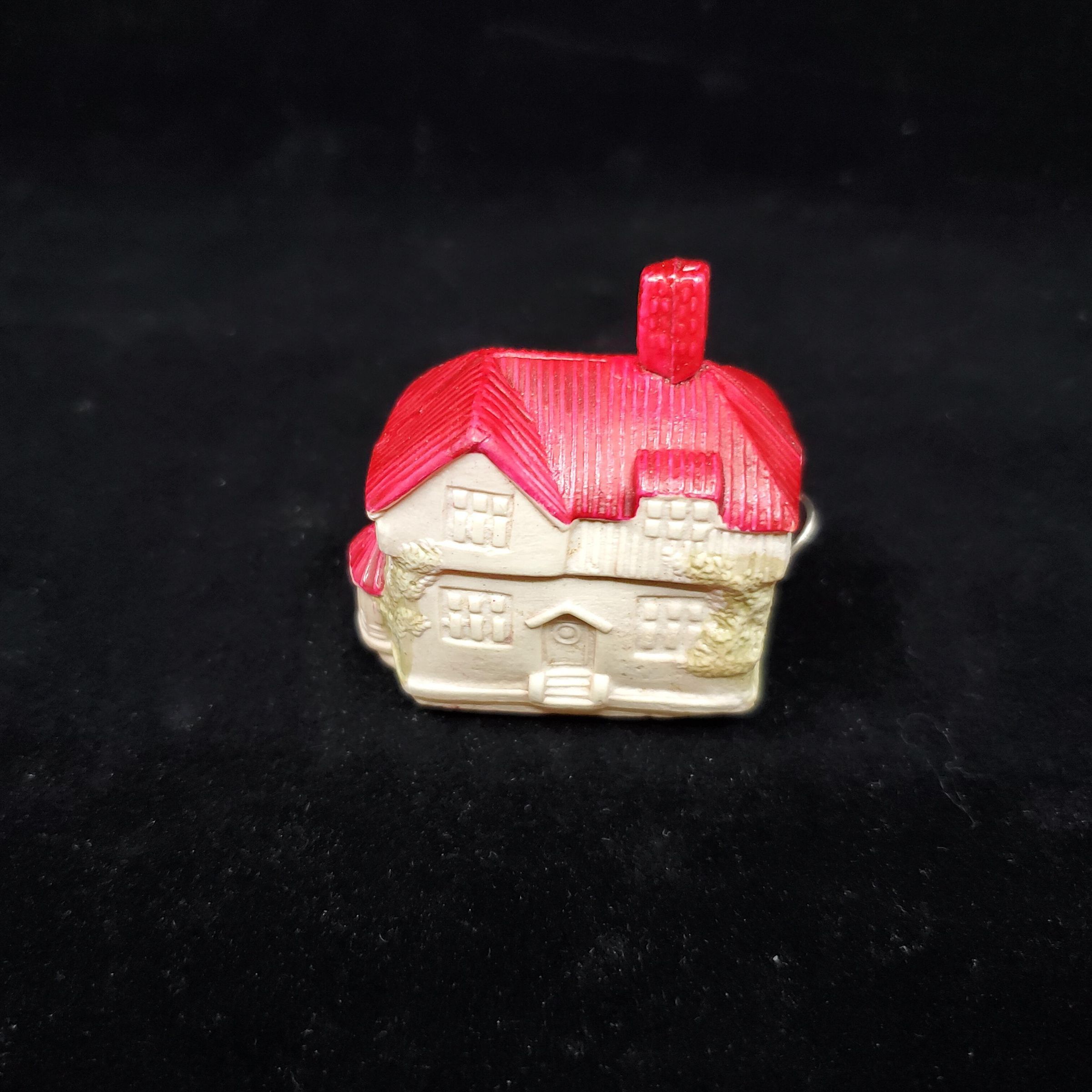 Cream coloured celluloid tape measure in shape of house. Two storey house with red roof and chimney. Green tree. Tape measure comes from side of house. Metric & Imperial. Tape is stamped Japan.