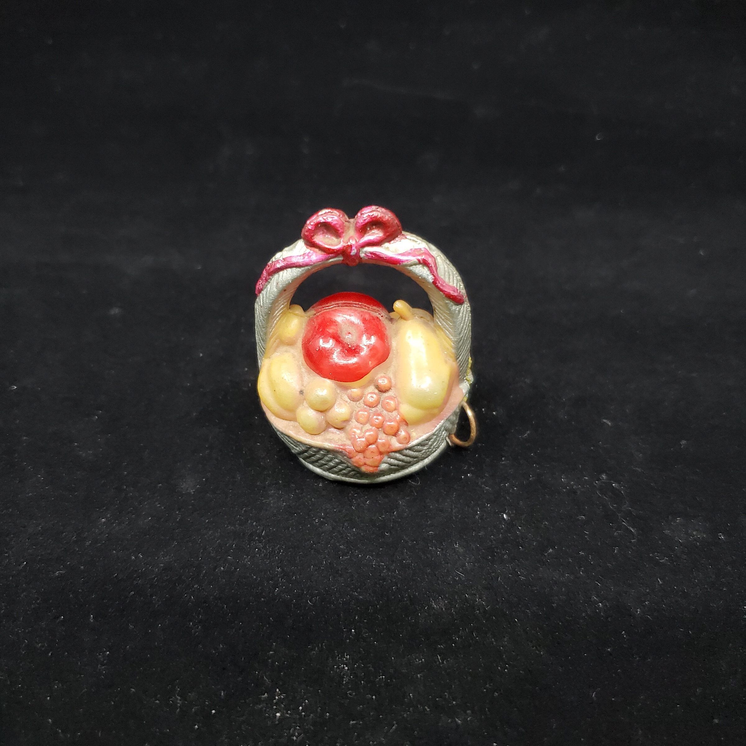 Early plastic - bakelite? tape measure in the form of a fruit basket. Grey basket with red bow at top and coloured fruit in basket. Tape comes from lower basket - whiite, stamped Japan.