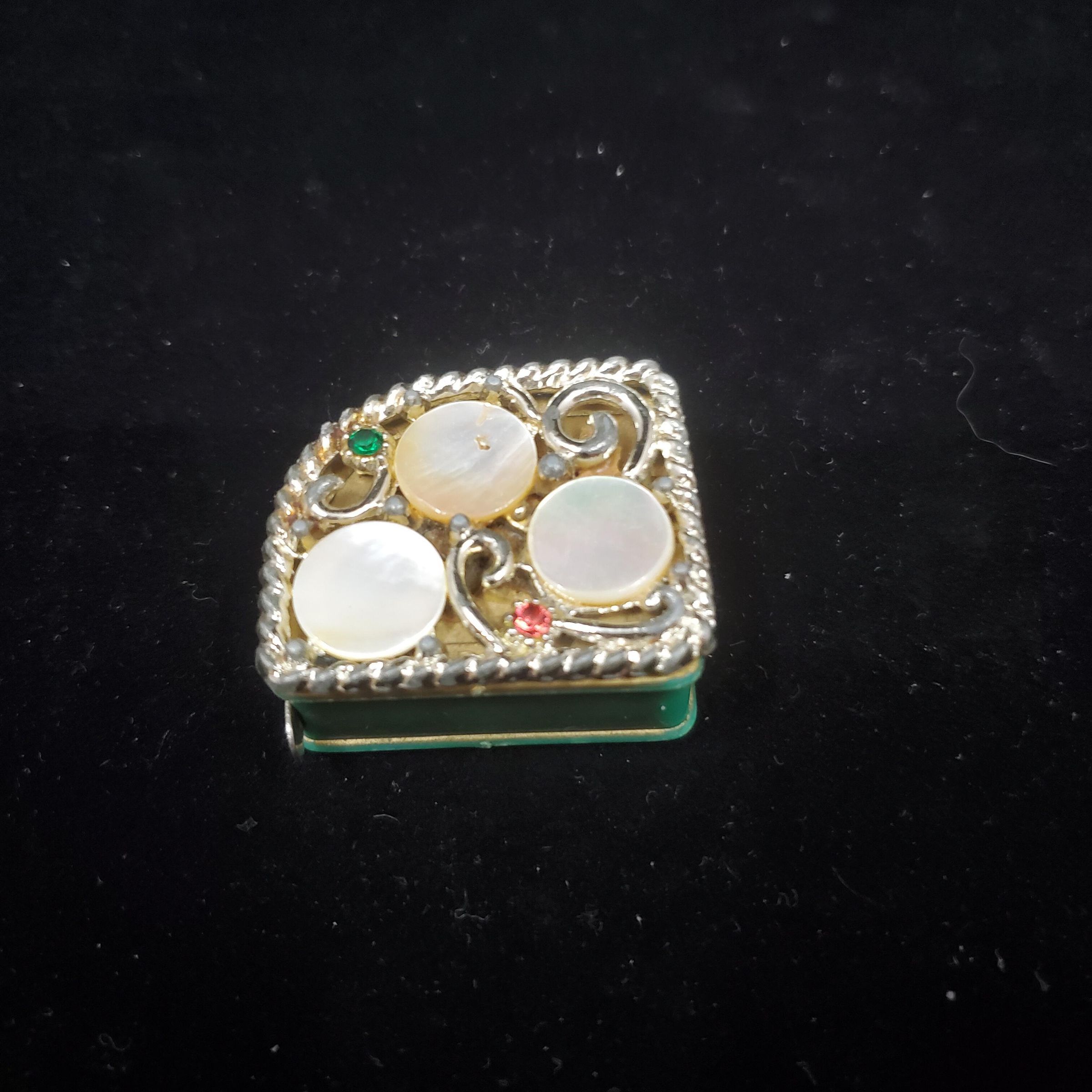 Green plastic tape measue with metal tape. Touches of gold paint in the green. Top - decorative, silver coloured rope outline with 3 Mother of Pearl rounds and 2 coloured - red, green - stones.