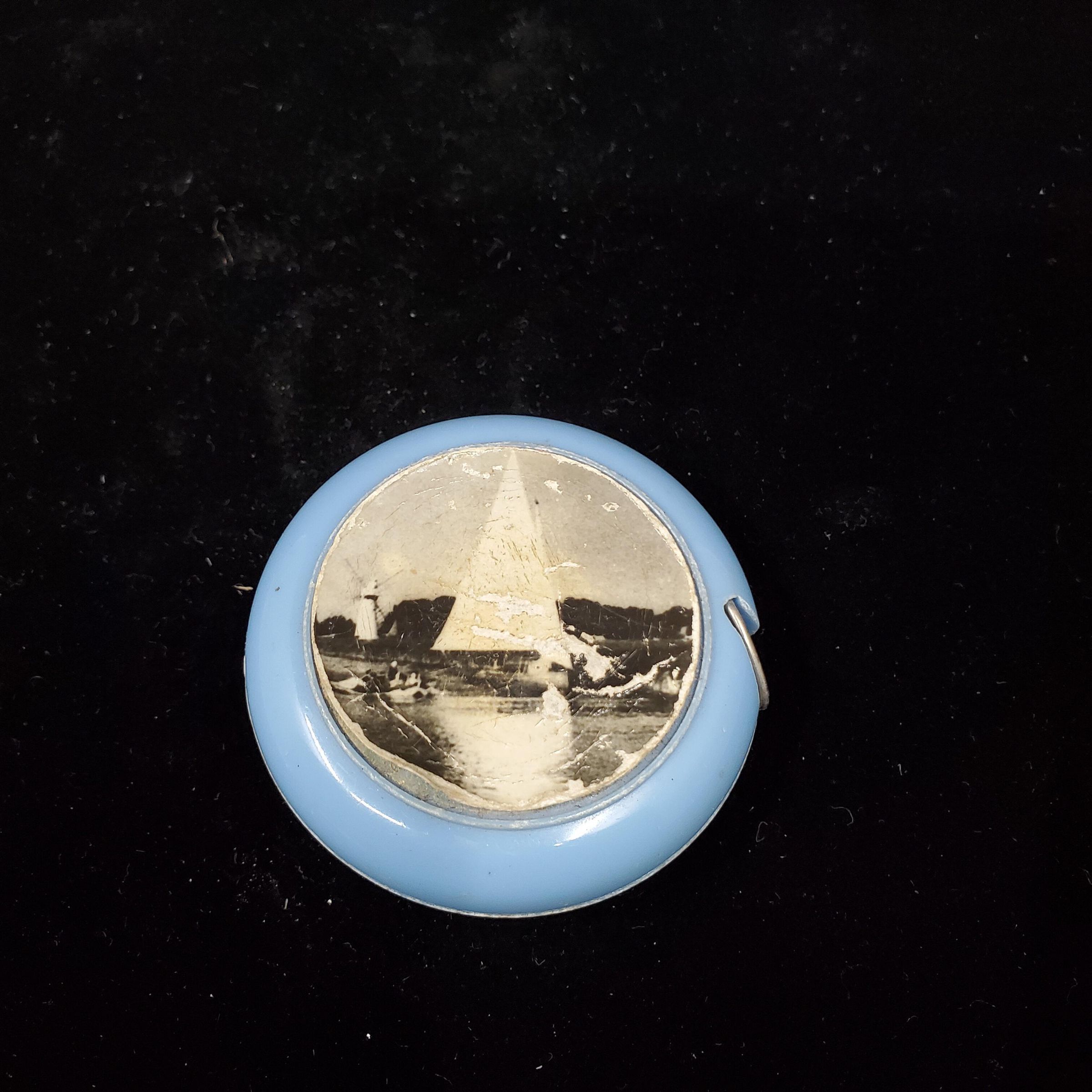 Round, blue early plastic tape measure. Top has black & white picture of water, sail boat and wind mill of Norfolk Broads. Picture on cardboard. Cloth tape with metal end.On back stanped ÒDean Made in EnglandÓ