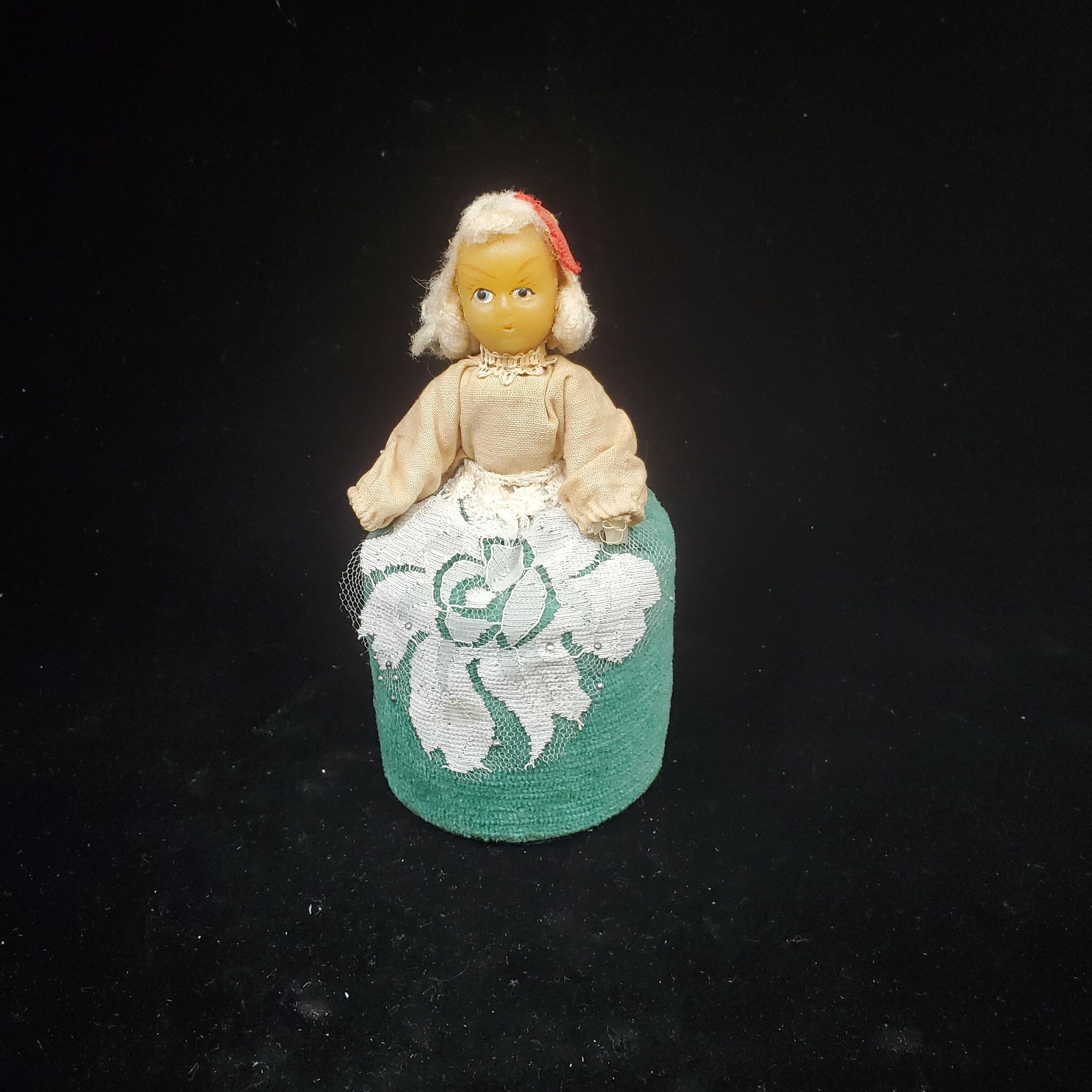 Combination tape measure, pin cushion doll. Green velvet skirt and base, white lace apron, beige blouse, rubber head and hands. Blonde hair, red cap on side of head. Tape comes from lower back - inches both sides, metal end.