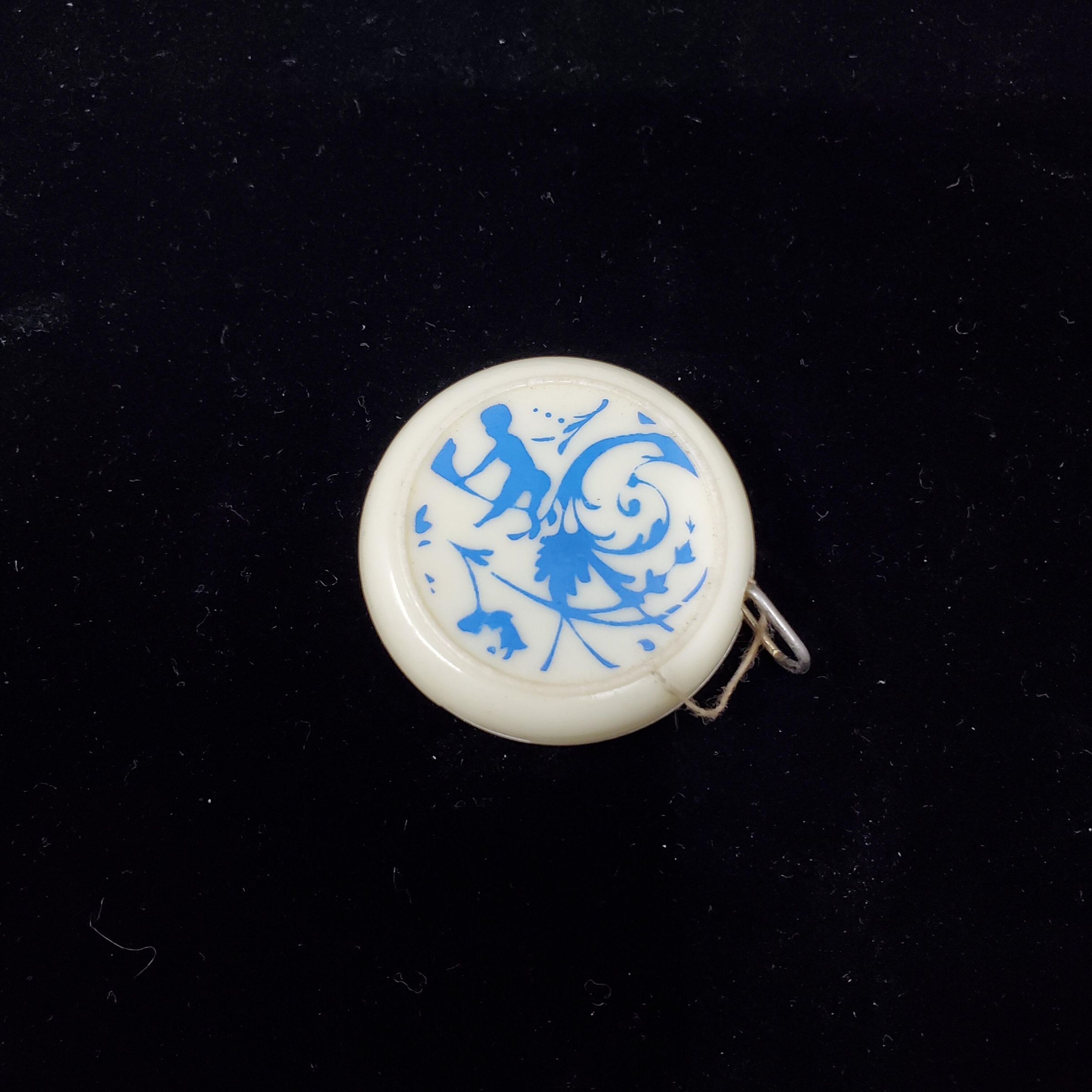 Circular cream coloured French Ivory (early plastic) tape measure. Top has design of elf and leaves in mid blue colour. Bottom of case has name Dean impressed and Made in England. Spring mechanism.