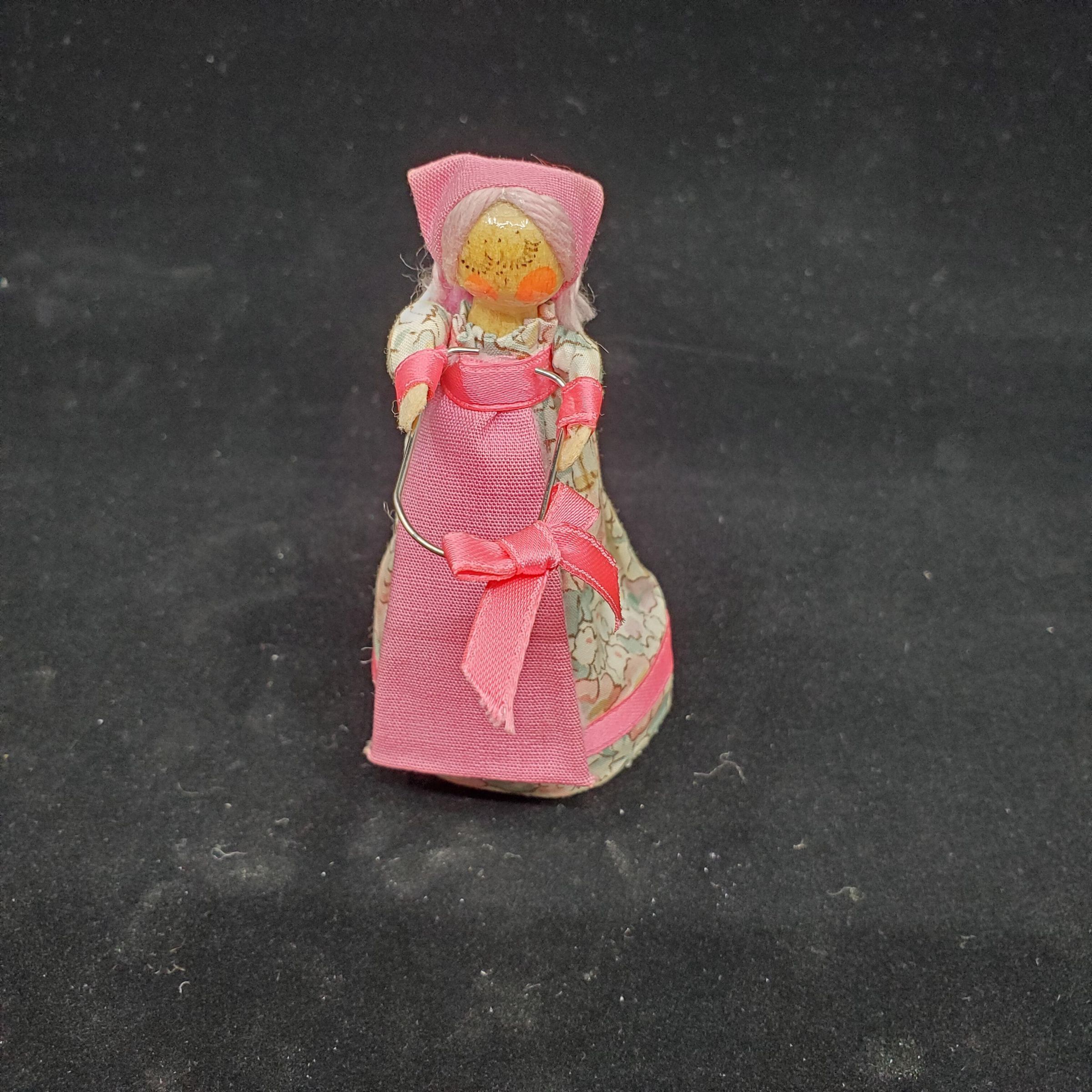 Tape measure, thimble holder, in shape of lady. Wooden head, painted features,long dress with pink flowers, pink apron, arms outstretched with plastic yellow thimble. Pink hair,( yarn,) and head scarf. Label reads ÒLiberty of London Made in EnglandÓ.