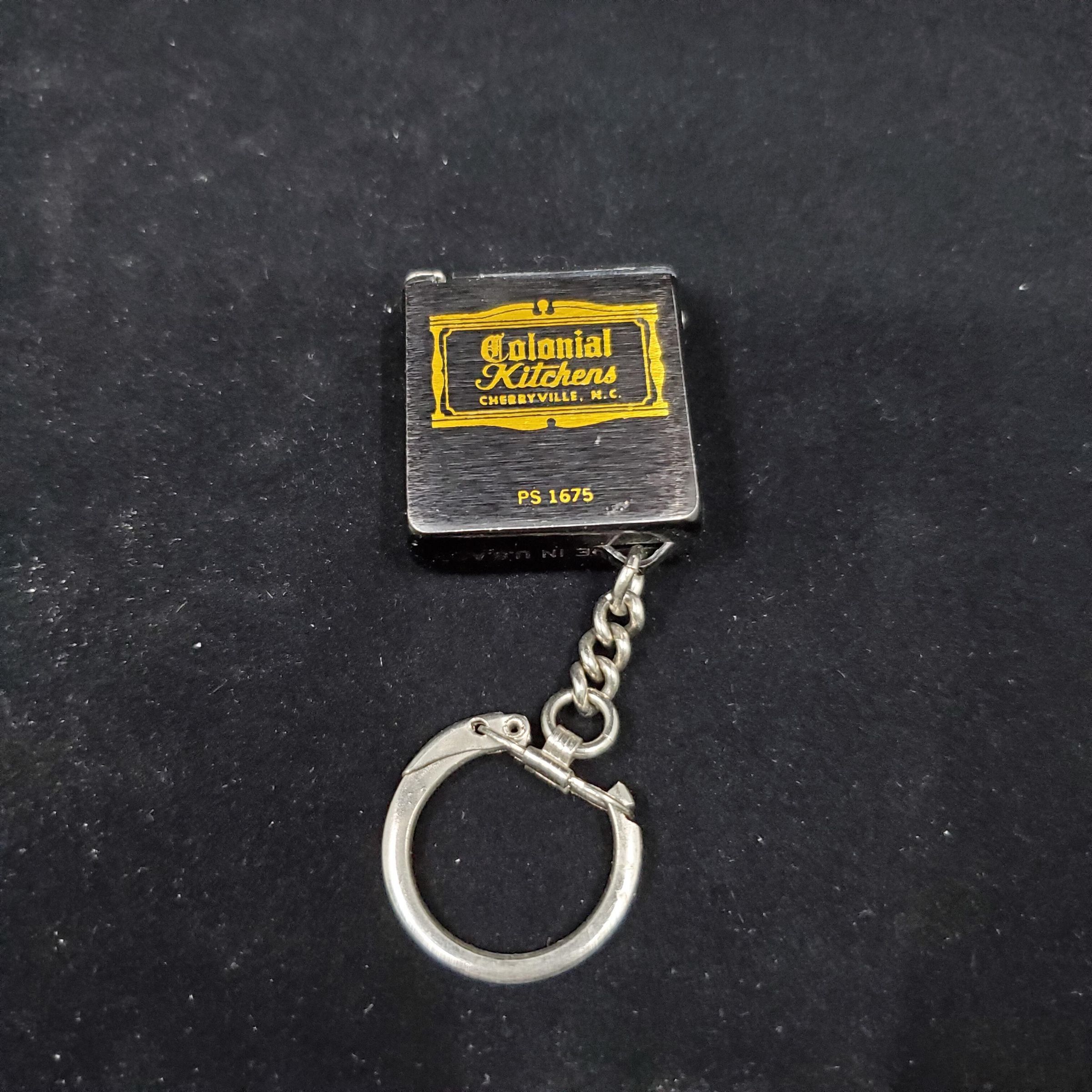 Tape Measure. Advertising. Black with gold print, and metal key chain. Whie plastic tape with metal end. Advertising on top outside in gold readsÓ Colonial Kitchens Cherryville, N.C. Ò and PS 1675