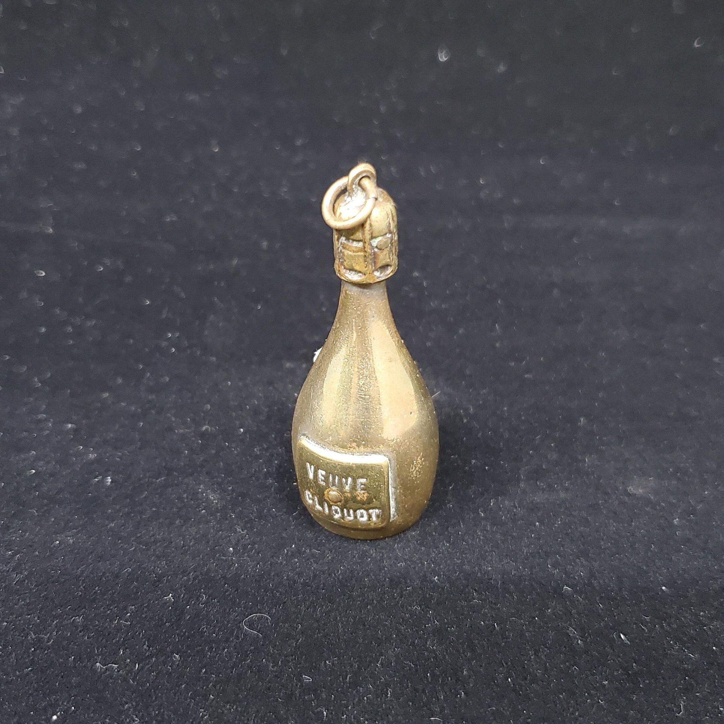 Brass tape measure in shape of bottle with ring at top. Top turns to retract tape. Cartouche on side of bttle with words ÒVeuve CliquotÓ