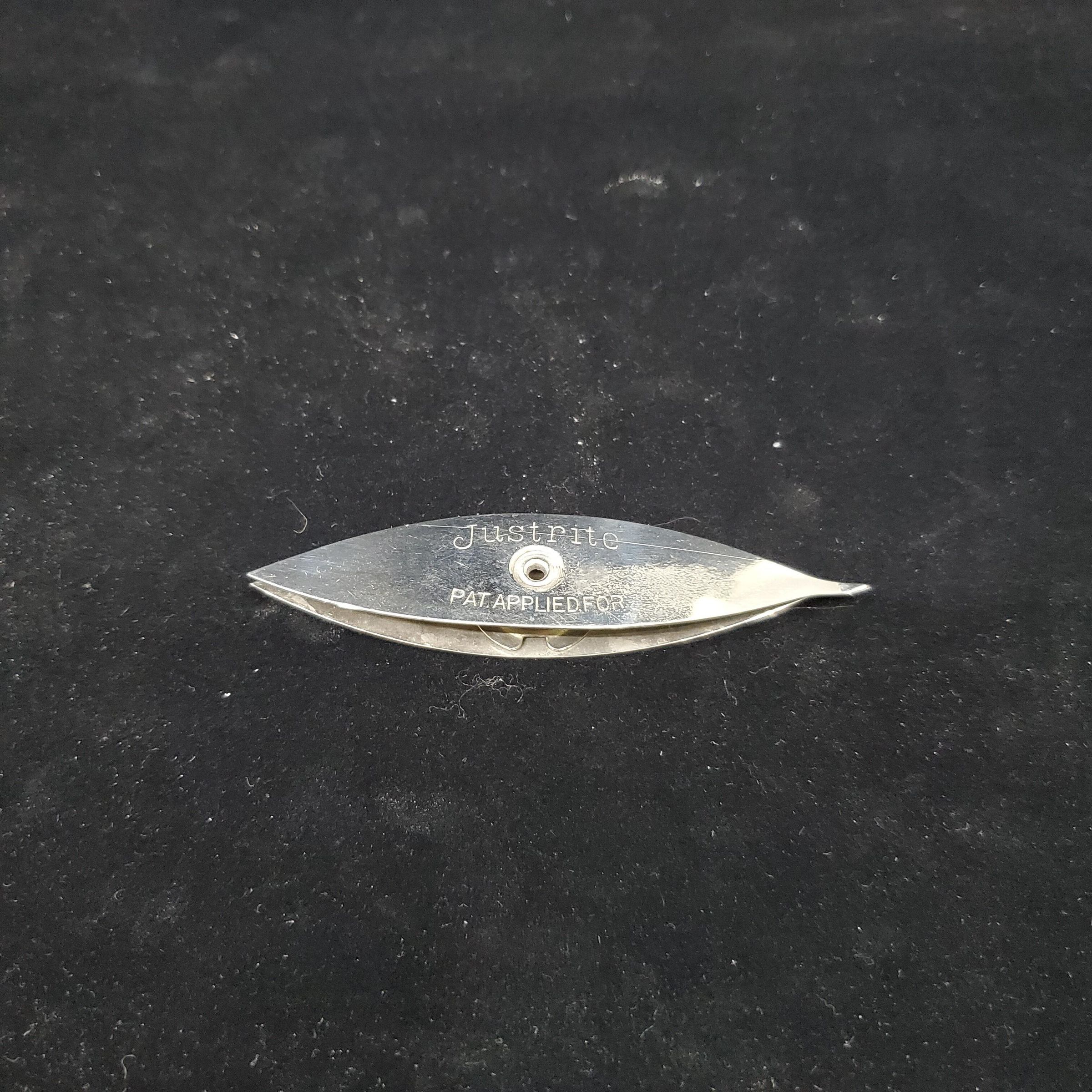 Nickel, silver coloured , tatting shuttle with ÒJustrite Pat. Applied ForÓ on one side. Sharp extended point on one end. With a twist the shuttle will separate ,making it easier to wind thread.