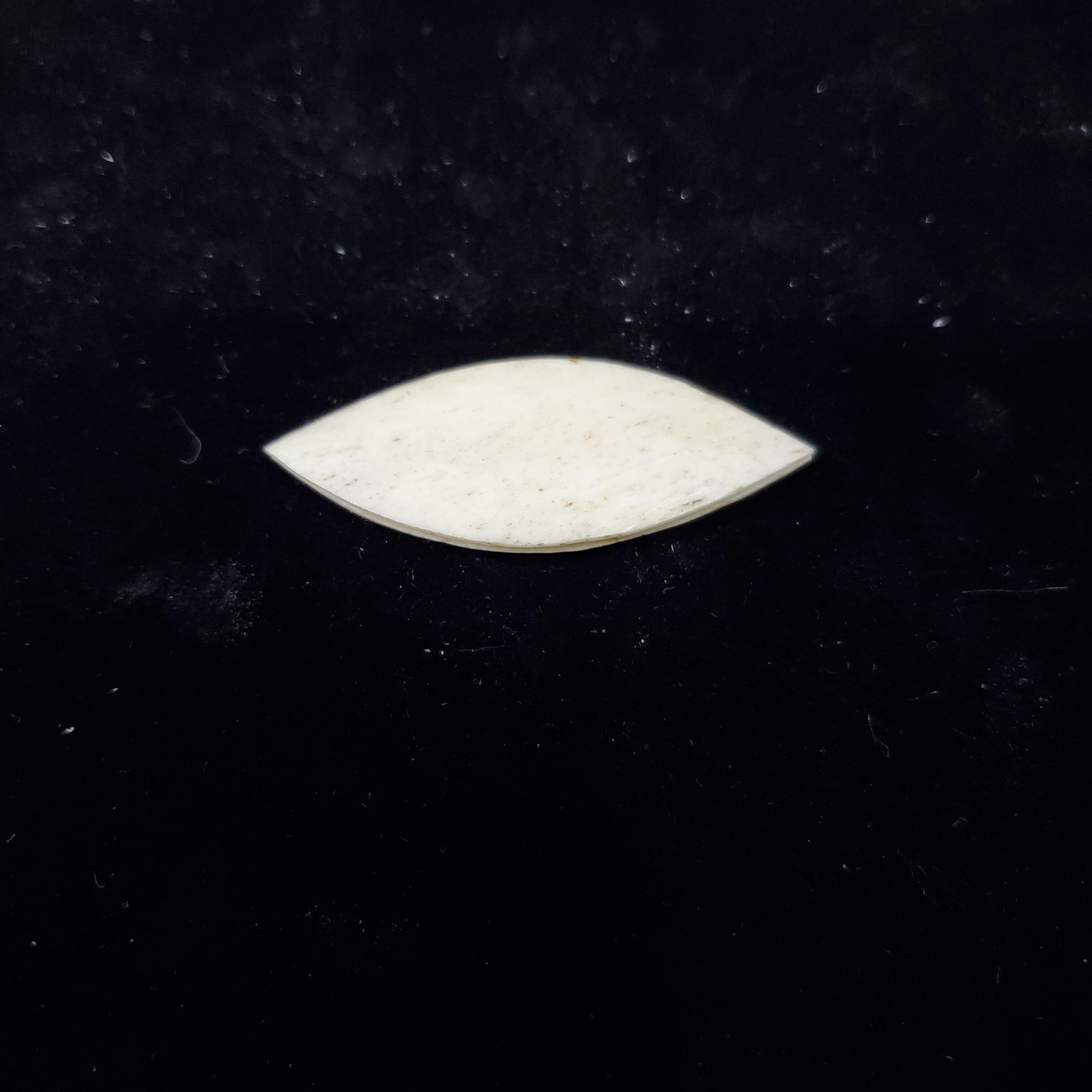Bone tatting shuttle. Hand crafted with very little, if any, room for thread to be wound between top and bottom. Lovely ` markings in light brown on cream coloured bone. Very small shuttle.