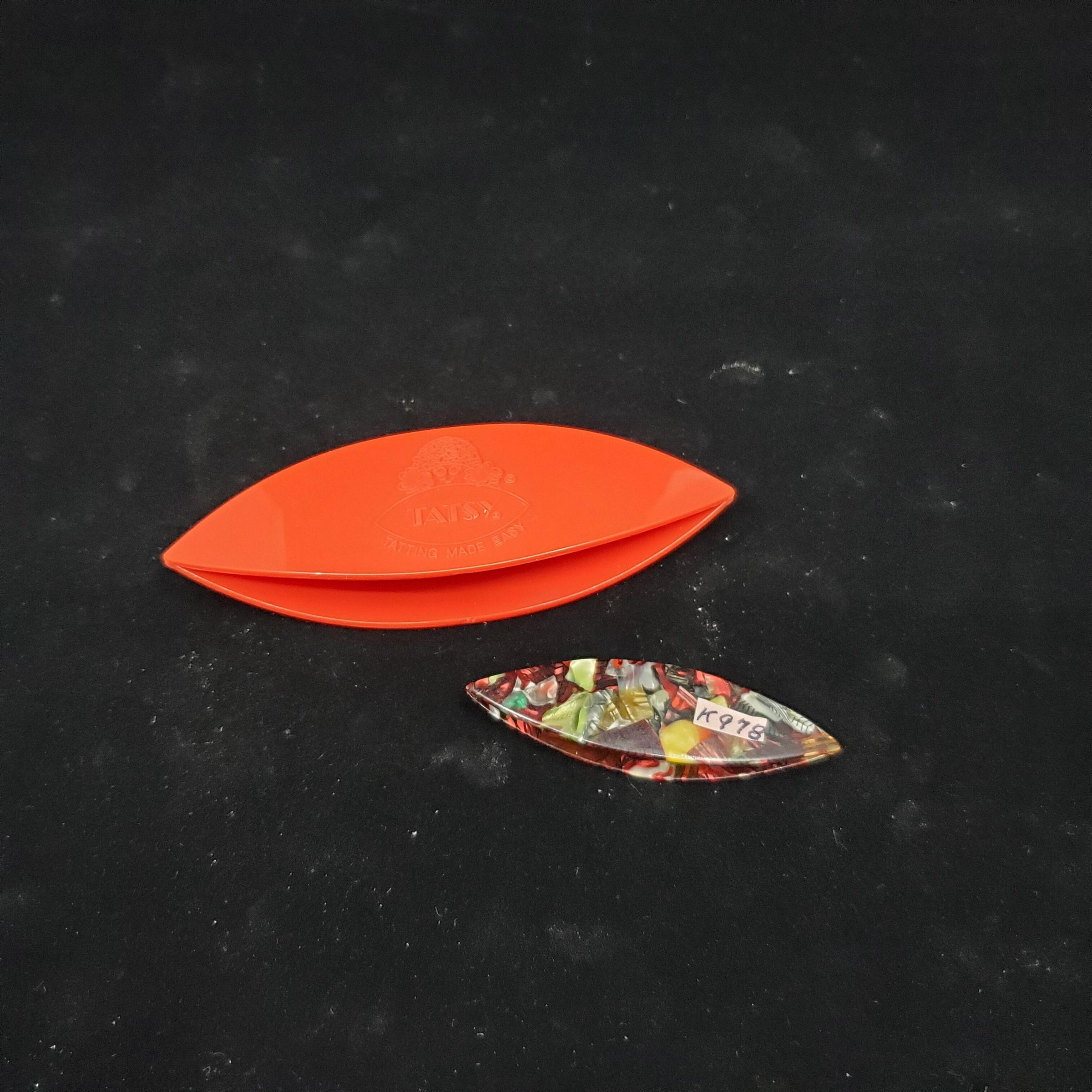 2 plastic tatting shuttles. One is a mottled red, brown and white colour - the usual size tatting shuttle-looks like mother of pearl.The other is large red and on outside has stamped Ò TatsyÓ inside a tatting shuttle shape . Above is a logo made up of tatted doilies and face.Below is stamped ÒTatting Made EasyÓ