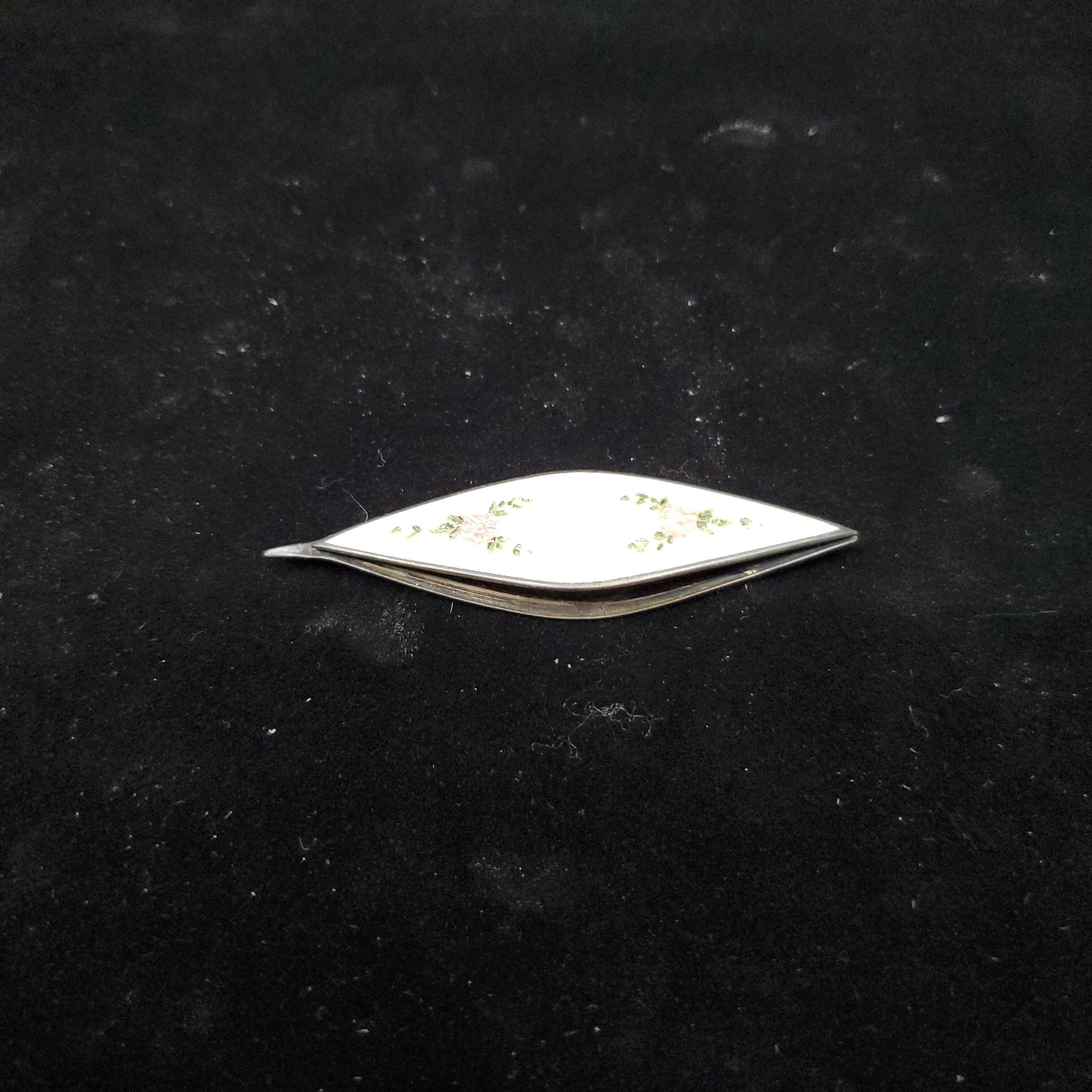 Sterling silver enamelled tatting shuttle.White enamelling one side with hand painted floral display - looks like moire silk background. Back plain silver with Webster logo and Sterling Silver.