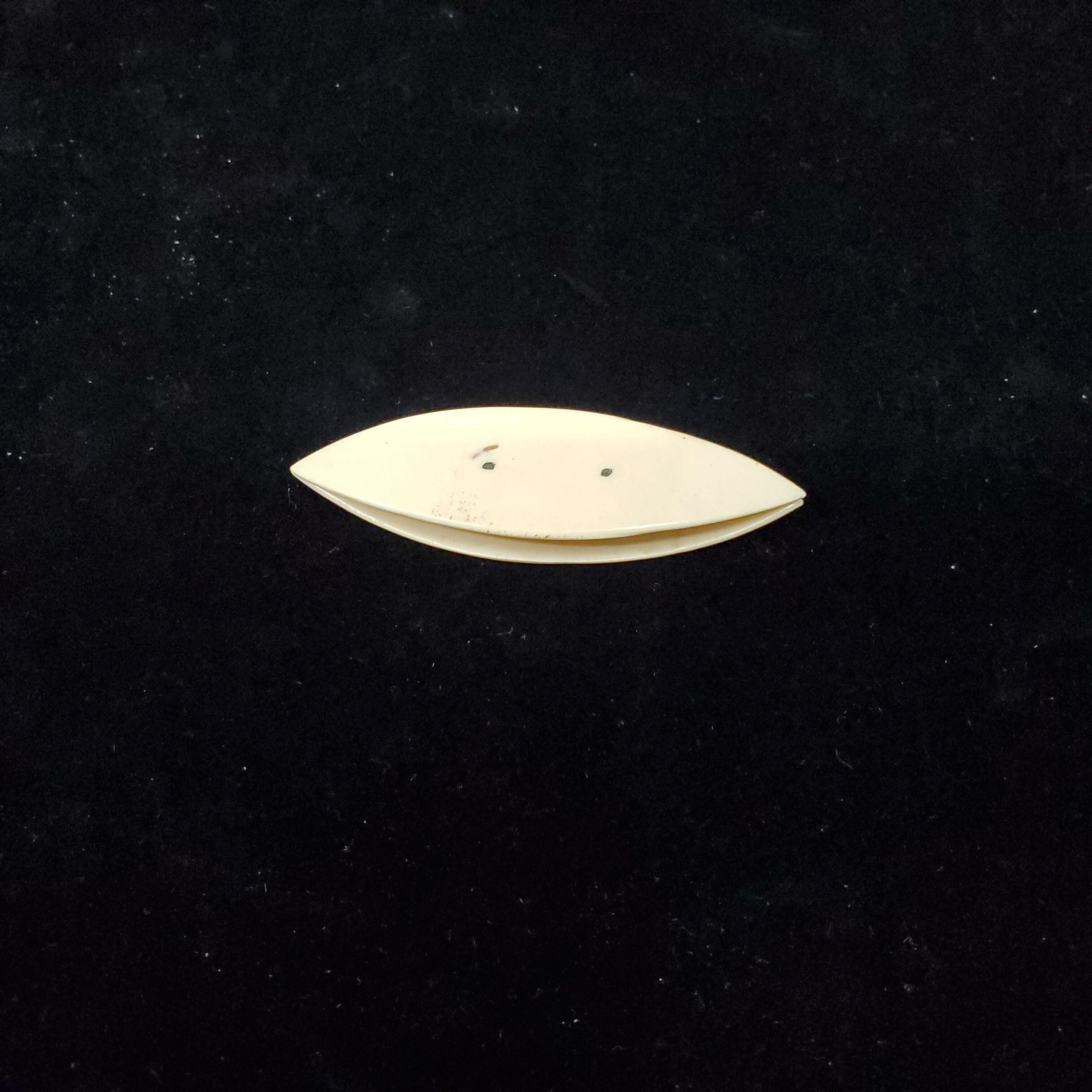 Ivory coloured early plasic, bakelite, tatting shuttle. Center post rivetted.