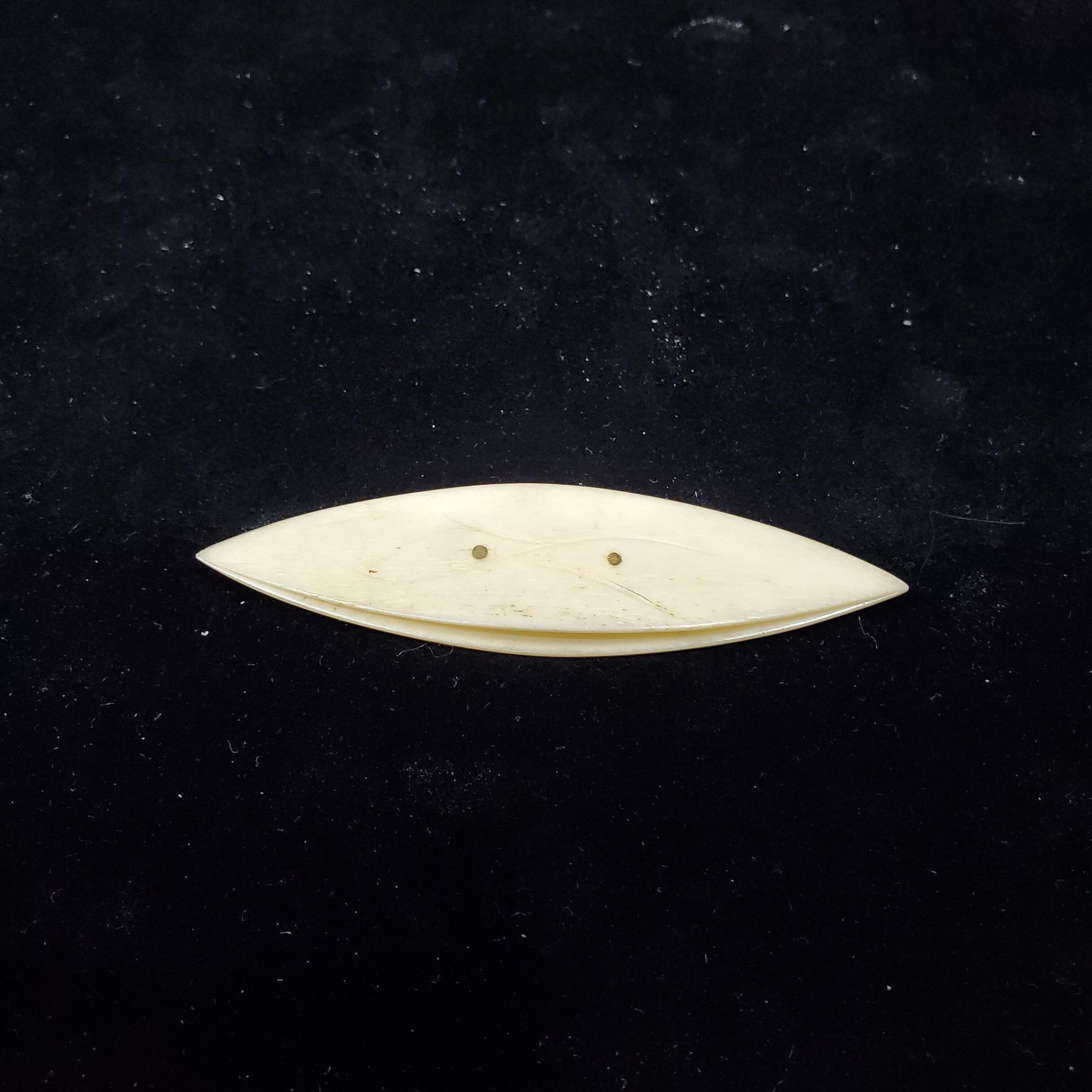 Bone tatting shuttle with brass rivets. Design on shuttle of simple curved lines on both sides. Ends touch nicely. Center piece intact.
