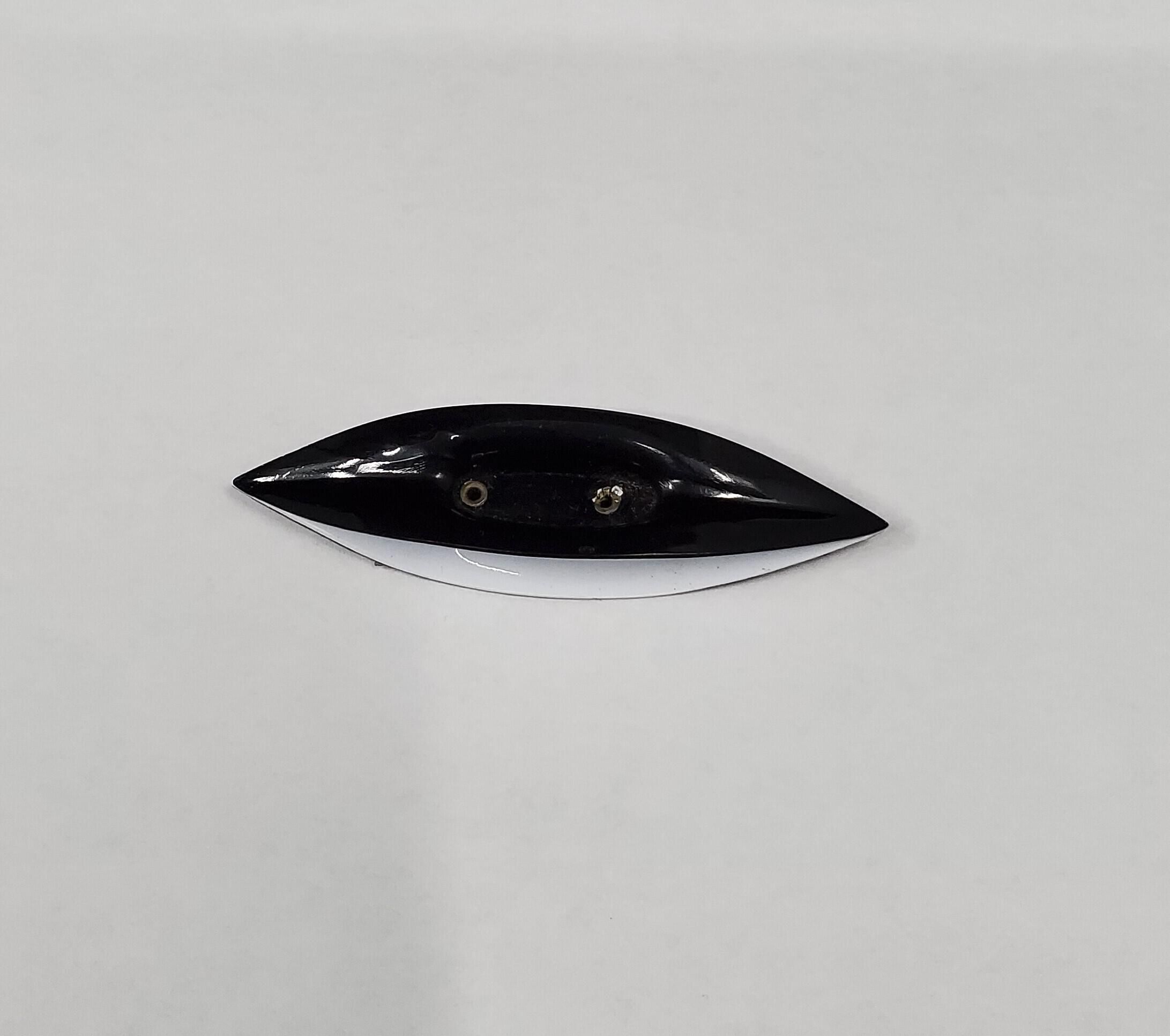 Tatting shuttle, black and white bakelite. Center sides impressed to form the post. Brass rivets. Center post has been broken and repaired.