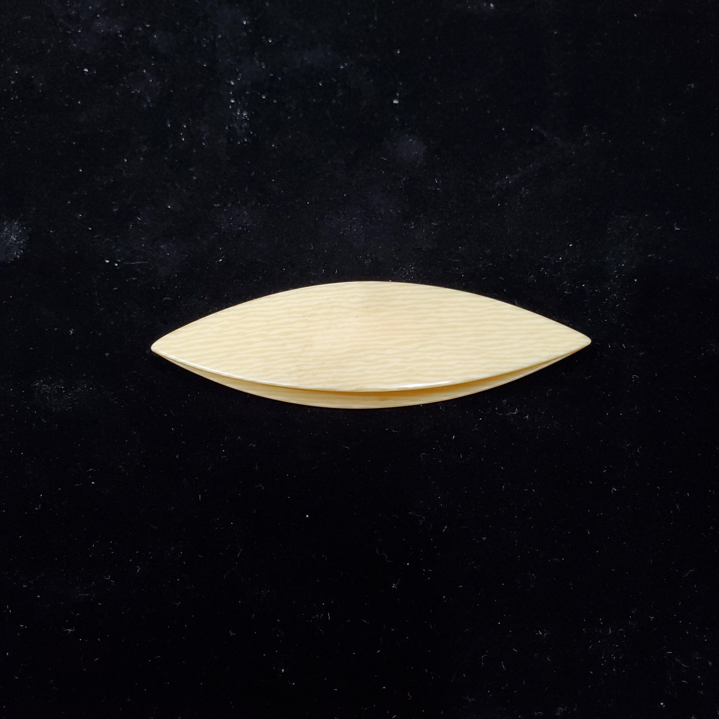 Cream coloured early plastic, celluloid, tatting shuttle.Gray lines throughout.Points together nicely. Center post good cndition.