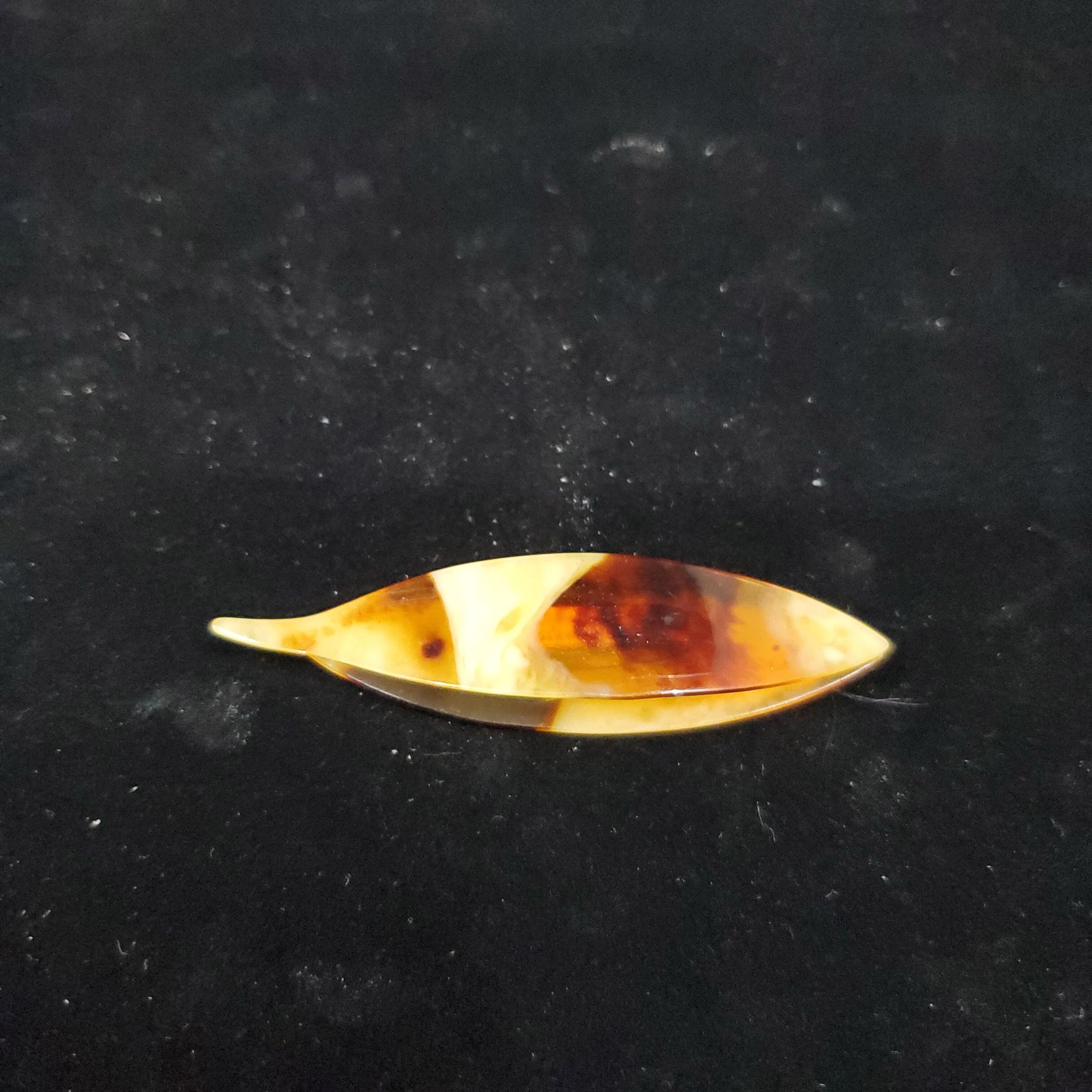 Mottled brown, cream coloured tatting shuttle with hook end. End not quite closed. Probably plastic.