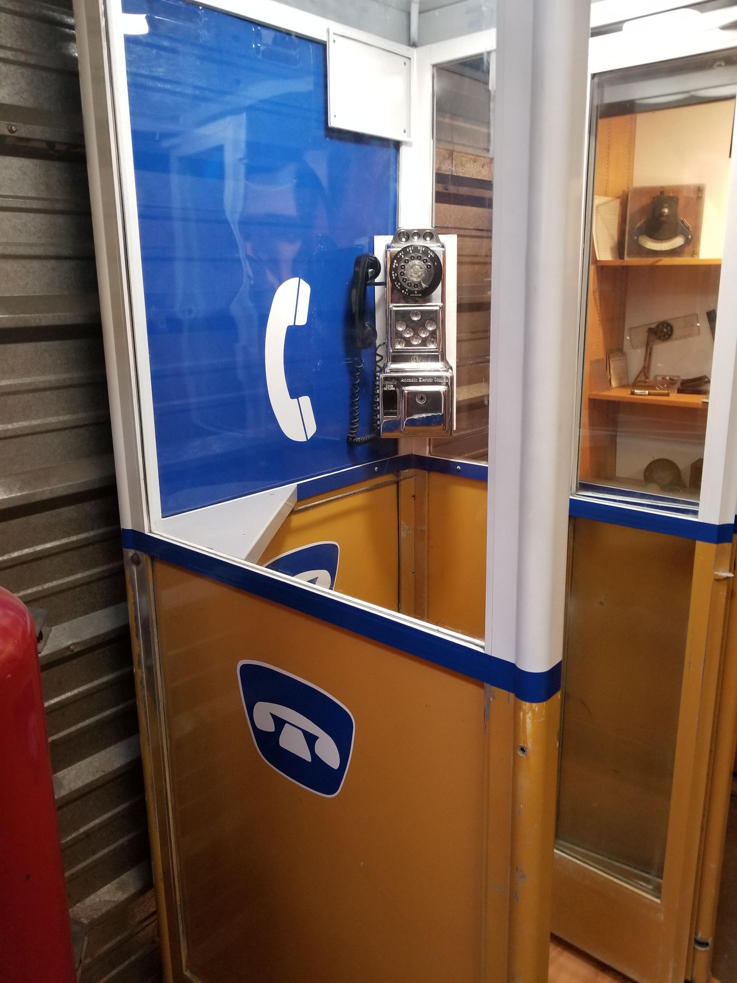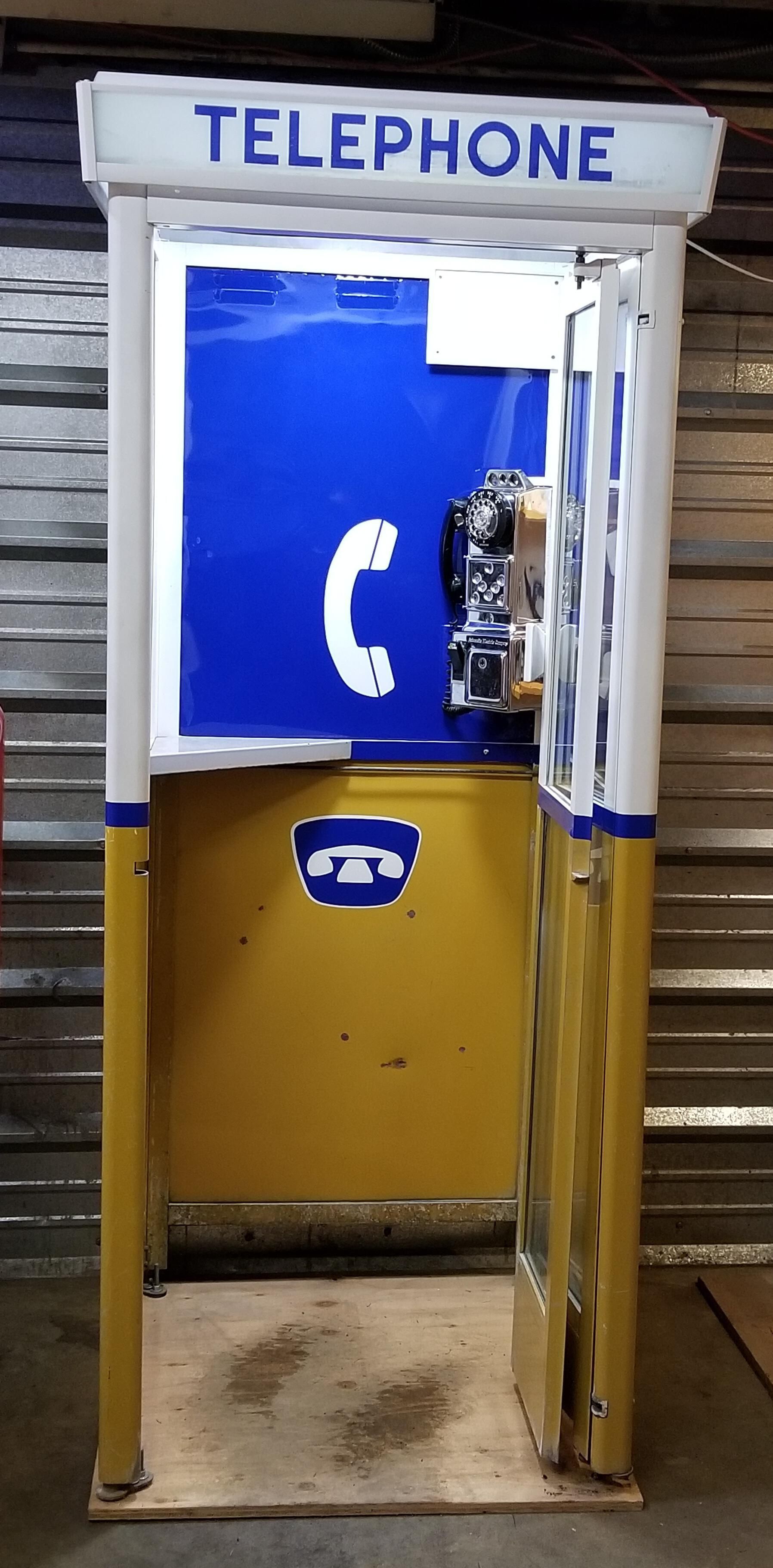 Blue and yellow telephone booth with folding door, and coin operated telephone.Context