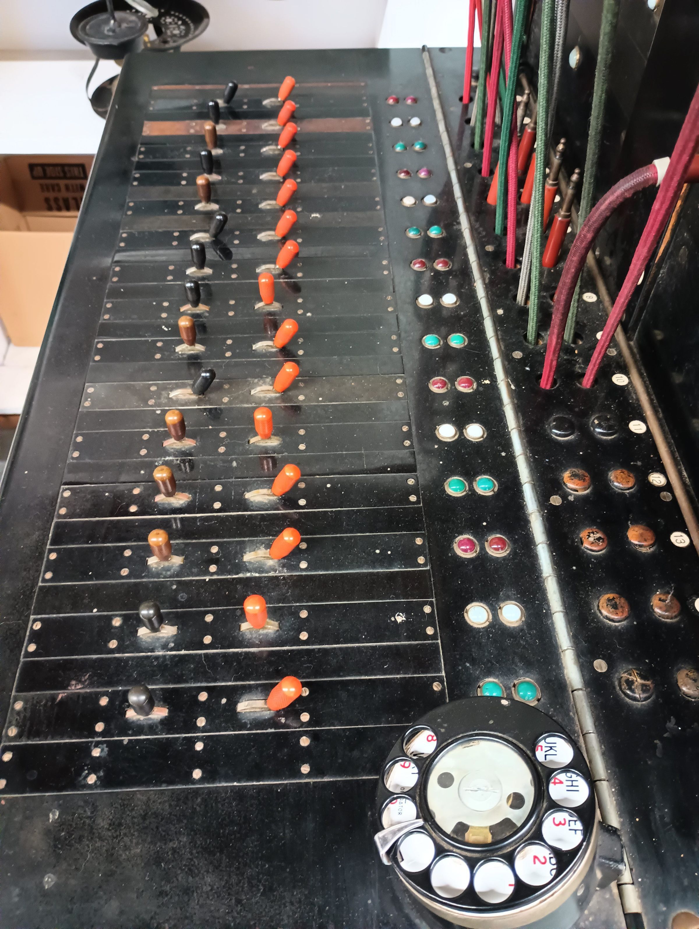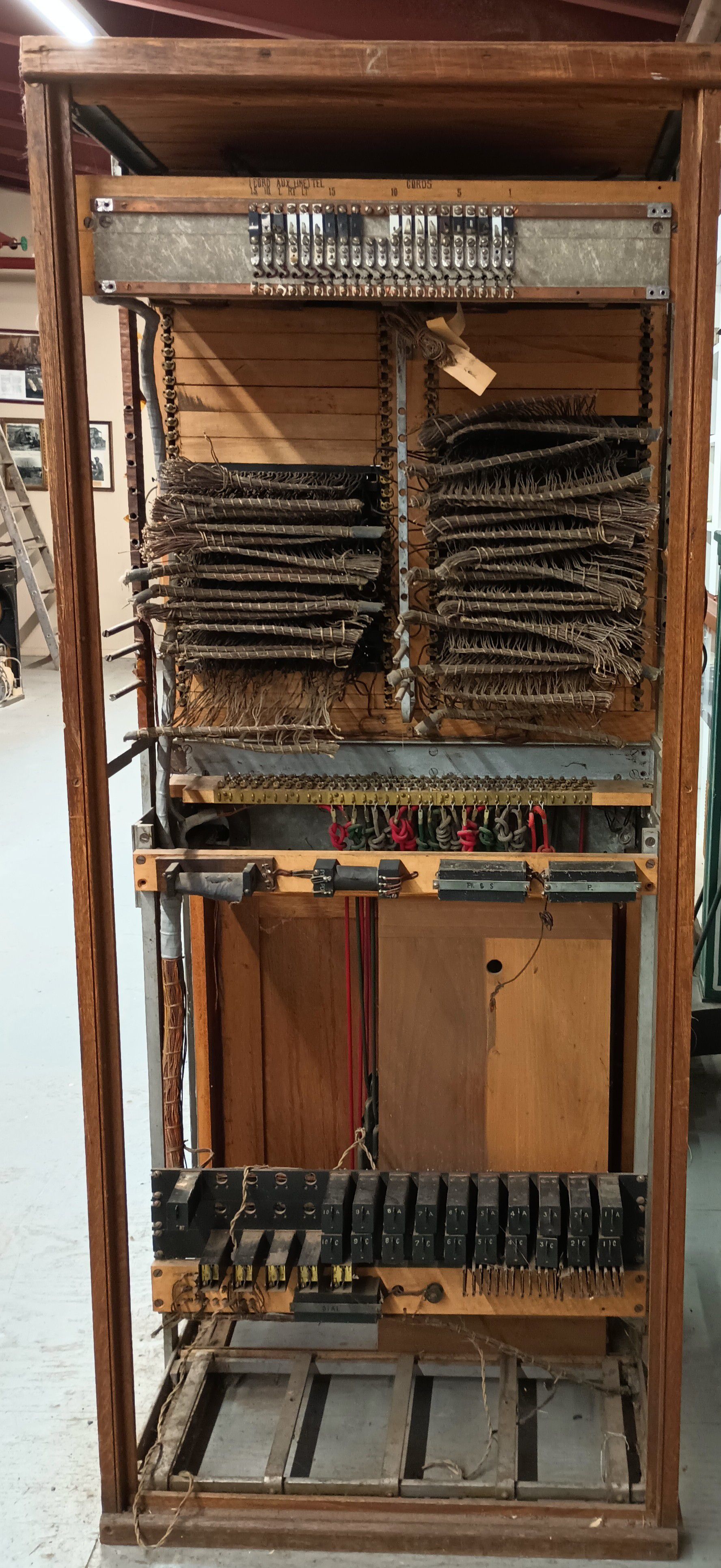 Tall wooden panel, with desk designed to accommodate an operator. The panel has rows of female jacks with lights. The desk has columns of 3-position toggle switches and lights, and a rotary dial.Use