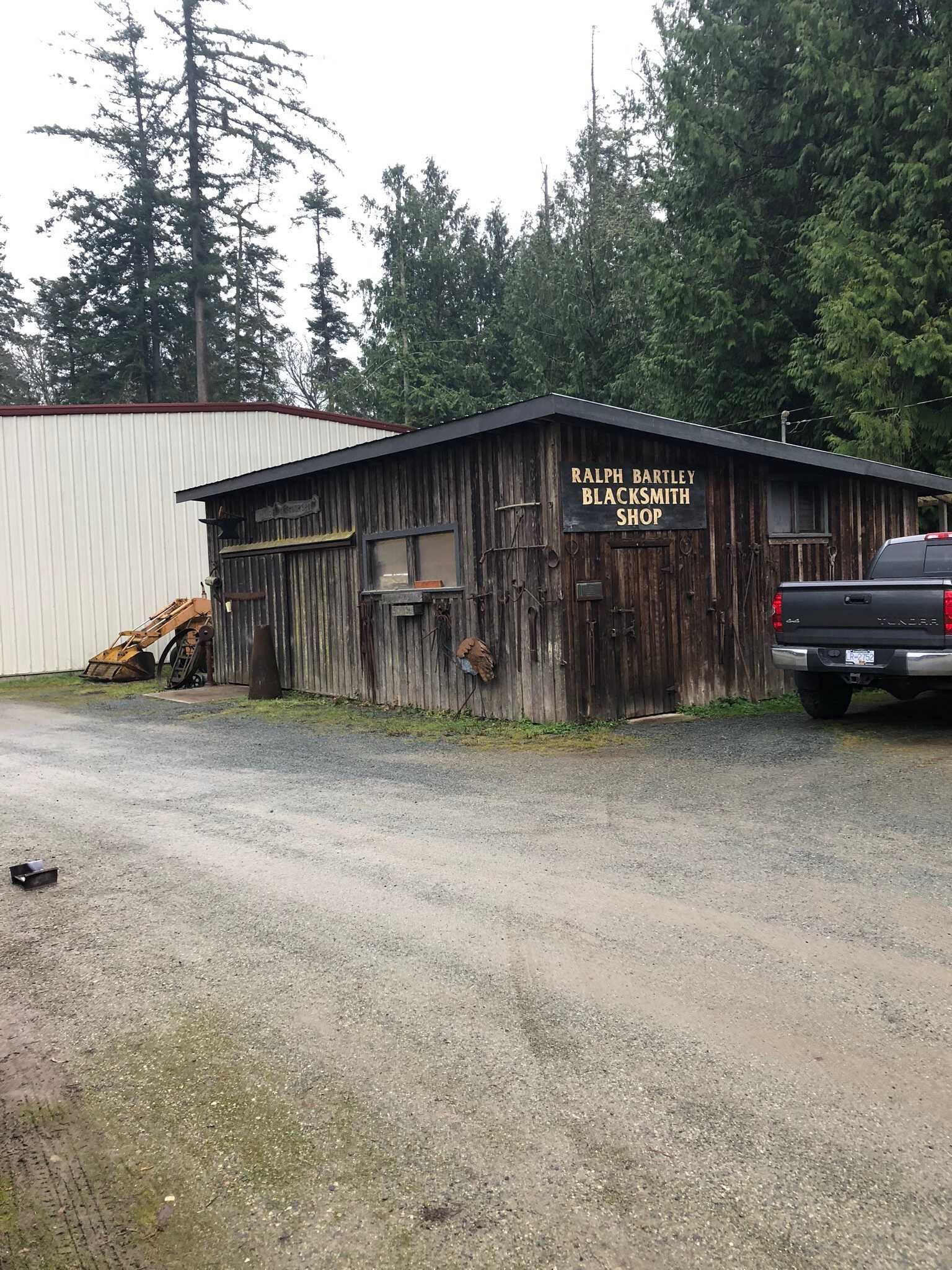 This building has a concrete foundation and floor with wooden frame construction and a metal roof. The building houses all our blacksmithing equipment including a trip hammer and a number of forges. The shop has been operational since 1987. The size is 20' X 14' X 9' rear wall.