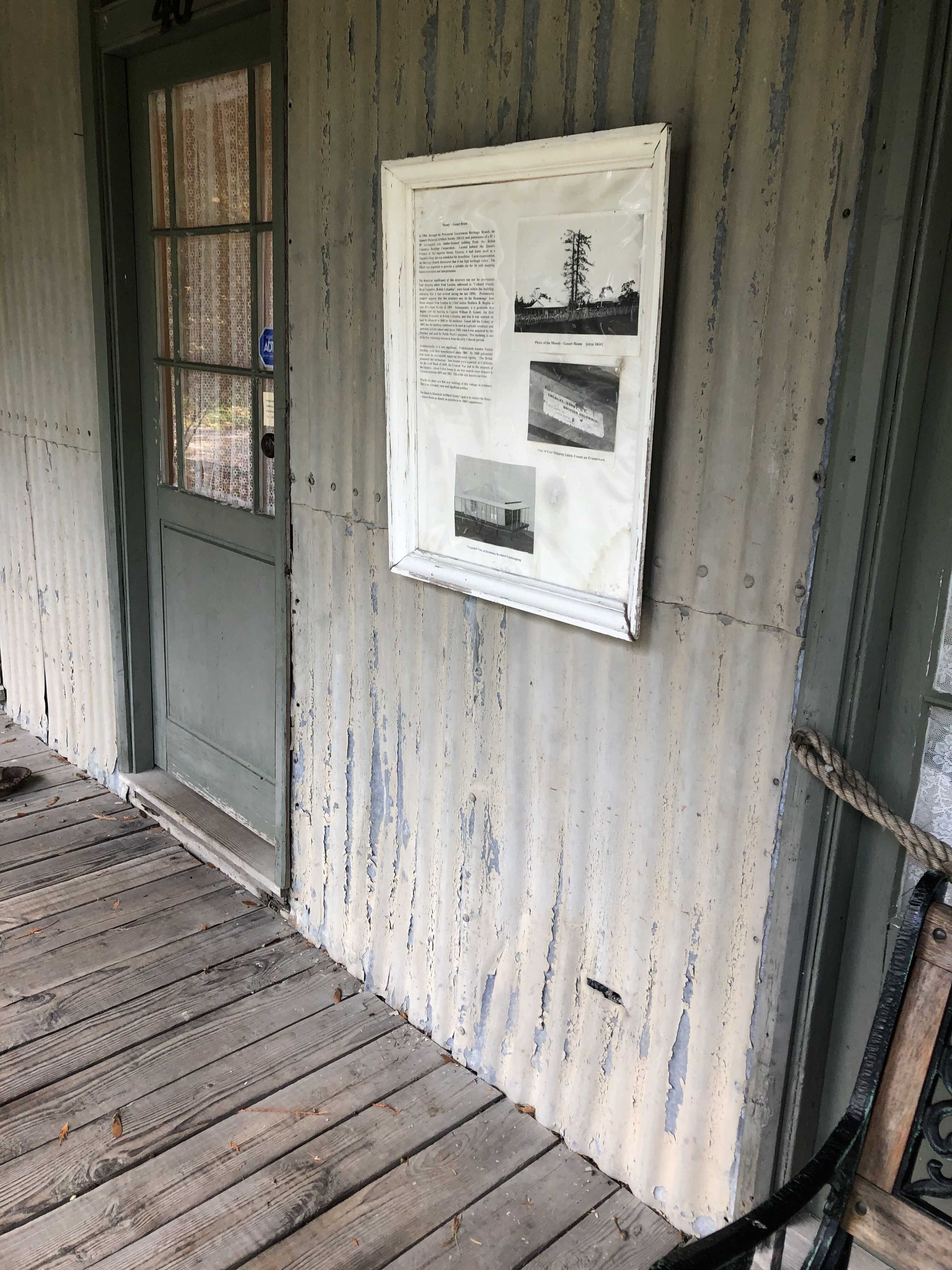 The historical significance of this structure cannot be overstated. Four shipping labels from London, addressed to “Colonel Moody, Royal Engineers, British Columbia”, were found within the building, indicating that it had arrived during the late 1850’s. Preliminary research suggests that this structure may be the Hemmings’ Iron House shipped from London by Chief Justice Matthew B. Begbie in care of Colonel Moody in 1859. Subsequently it is probable that Begbie sold the building to Captain William D. Gosset, the first Colonial Treasurer of British Columbia, and that it was erected on land he obtained in 1860 for his residence. Gosset left the Colony in 1862 but the building continued to be used as a private residence and part-time private school until about 1900, when it was acquired by the Province and used for pubic works purposes. This building is one of the few remaining structures from the early Colonial period.