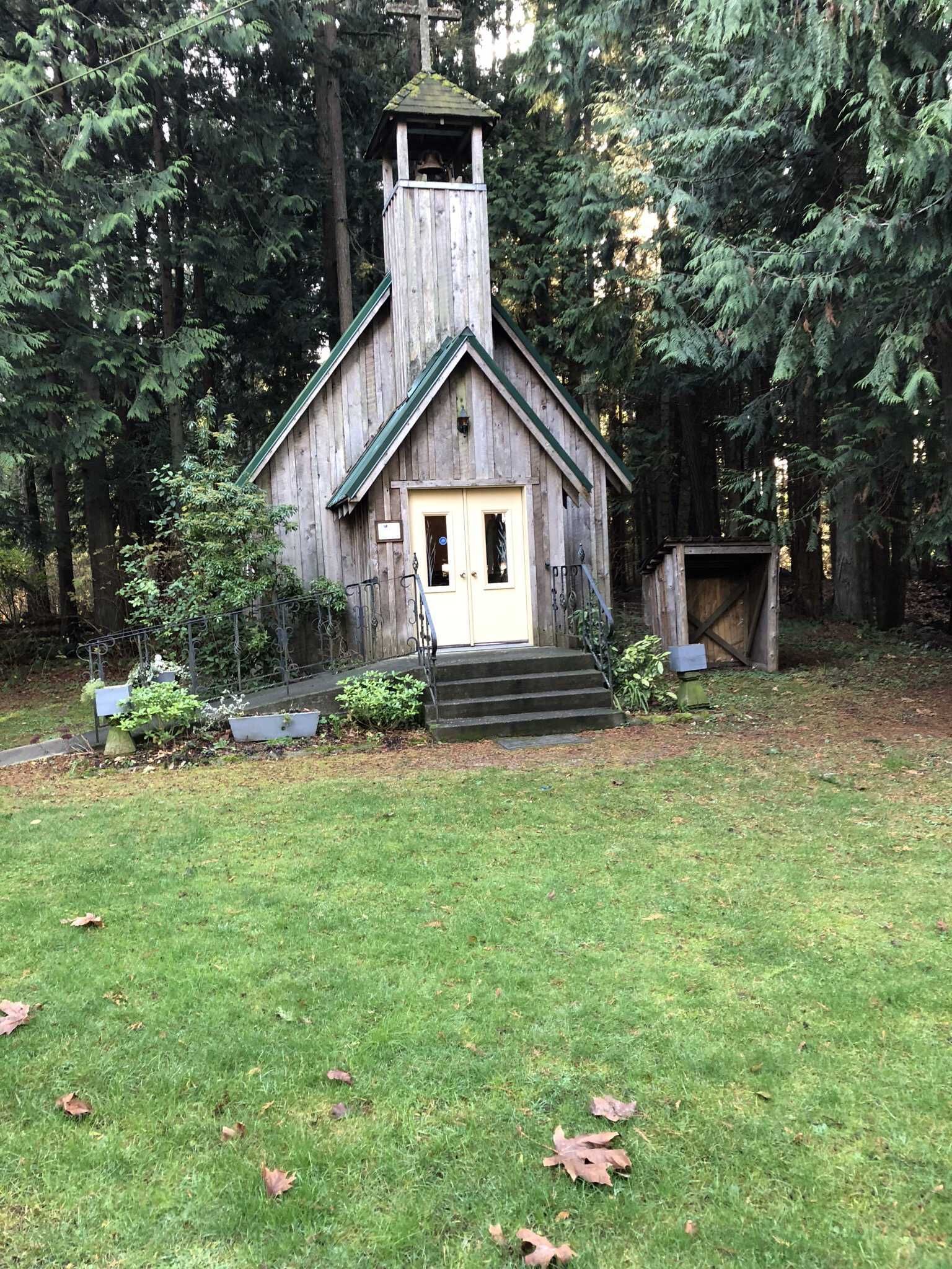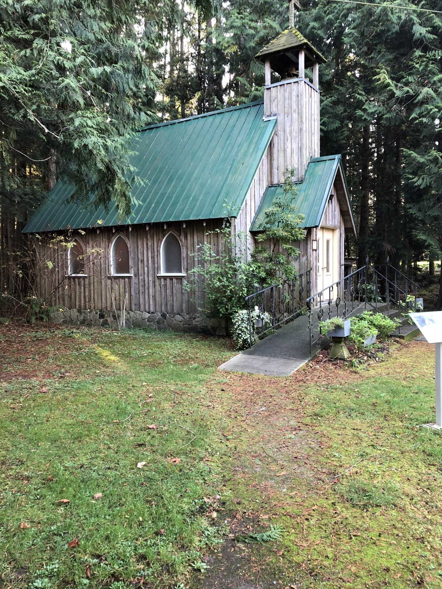 The construction was performed entirely by society volunteers using mostly materials milled on site. The church was dedicated in a ceremony in 1990. It is available to the public for weddings or memorial services at a modest cost. The church is non denominational . It has a locally made stained glass window. The pews are from a local pioneer church. The electric organ was left to the church by a local lady. There is a historic bell in the tower. The front steps and ramp make it wheel chair accessible. Most of the materials were manufactured on site including the wrought iron work. The size is 29' X 16' X 8' wall.