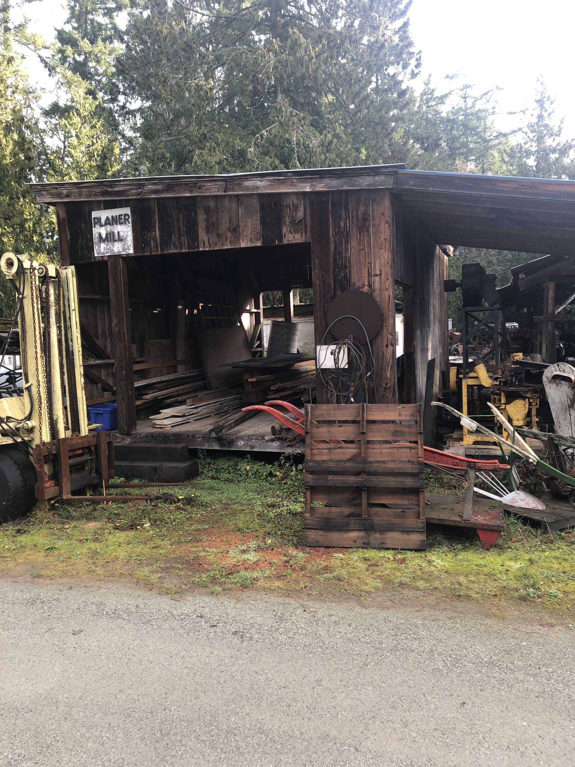 This is a portable wooden shed built on skids and with a single pitch duroid roof. The size is approximately 24' X 16' X 12' at the rear wall. The roof has since been replaced with corrugated steel. The building has two open ends in order to pass the lumber through the planer. In this building there is a raised and fenced spectators walkway. The power for the planer is belted from a portable engine, either steam or gas, from otside the building. It was constructed by volunteer labour with our own lumber plus about $350 for roofing material.