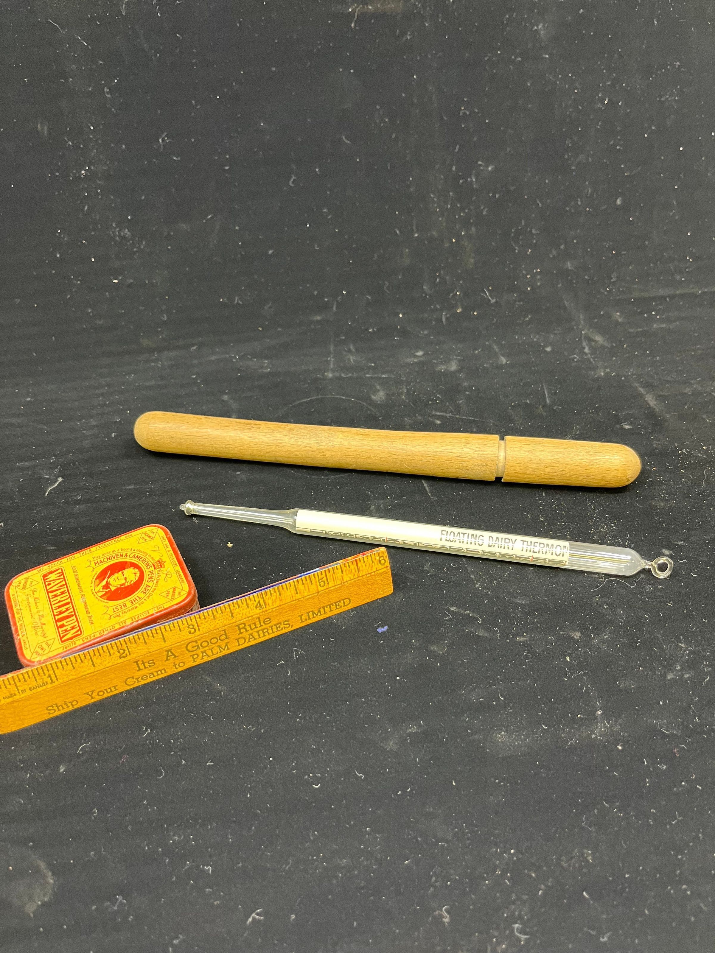 Floating dairy thermometer in round cylindrical wooden case