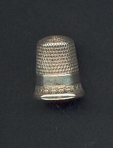 Sterling silver thimble with wide band at tim. Currant design on border. InitialsMJ on band. .Knurling from band to and over top. in apex the logo of Ketcham McDougall with Sterling below.