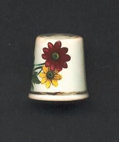 Squat shaped thimble with flat top,. pale green overall wash.Indented circles on top. Screen printed flower design on side- two large daisy-like flowers,one maroon, one yellow with green leaves on side. ÒHollandÓ hand painted inside. Greenish black band around rim.