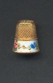 Gold plated, slightly fued thimble, Hand painted garland border. Catalogue said made by Schildkraut in the Tyrol, Austria..