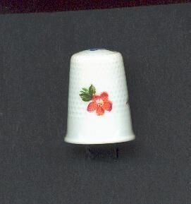 White porcelain thimble slightly fl;uted.Plain band at rim. Simulated knurling above and over top with three small flowers,one red,one blue, one purple with leaves around thimble and a blue flower with leaves on top. Sold as from Limoges, France but no marks on thimble.