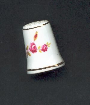 White china, slightly fluted with fine gold line at top and near rim.Two sprays of roses(two) with bud and green leaves around side of thimble/ Decal./ Inside red flower, green leaves with crownabove and Bone China Made in England below the flower.