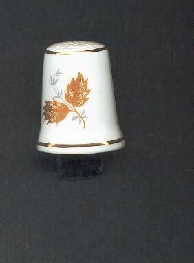 White bone china thimble slightly fluted with fine gold band at top and rim.Two designs around thimble of two gold leaves with fine gray-green leaves. Decal. Inside a red flower with geen leaves over which is a crown. Above the crown is Royal Adderley and below it says Floral Below the flower it reads Bone China Made in England.