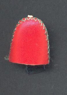 Finger shield of black and red leather, seamed at side with green stitching. Label, paper, with 'Made in Korea'