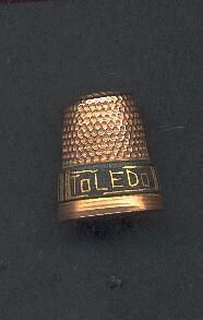 Brass thimble with plain band at rim, wider added band above rim, and knurling to and over top. Added band is black and gold strap-like design with the words ÒToledoÓ.