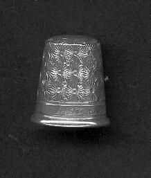 Sterling silver thimble with rolled rim. Over-all Chrysantheum pattern above a narrow band above rim.English hallmarks on plain band for Chester 1919 Maker C.H. (Chester Horner)Size mark not clear.