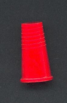 Tall - 1 and 1/4 inches red plastic thimble with raised edge. Wide plain area above then 6 raised circular lines above to top. Top flat.