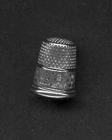 Silver coloured thimble with rolled edge. Wide band above,ribbed, with three rows of stars through it. Stamped Germany and 3 (size) on band.