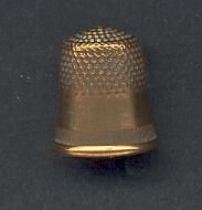 Brass thimble with rolled rim. Narrow ribbed band above rim. Wide plain band above with 7 (size) on it. Knurling to top and over. No other marks.