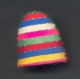 Pure silk over leather finger guard.Thimble shaped, multi-colored stripes of silk,seamed together with green embroidery thread. Paper label with Made in Korea.