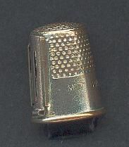 Brass thimble,rolled rim wide plain band then knurling to top and over. A cutting blade and wire needle threader has been applied to thimble. On plain band is stamped ÒM.T. PatÕd 10 Made in U.S.A.Ó