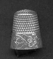 Sterling silver thimble with wide plain band at rim. Leaf and Daisy -six petals pattern Initial D inm cartouche. Sterling 9 (size) and a small 5 pointed star above the initial. See American Silver Thimbles by Gay Ann Rogers page 114.