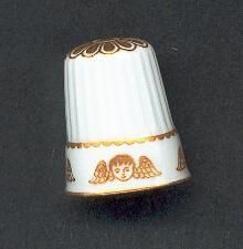 White china thimble with gold design.Band of pattern at rim with 4 gold cherubs and a fine gold line above and at rim. Gold floral design all over top. Body consists of fine vertical indents.Stamped inside Spode England Fine Bone China.