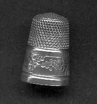 Silver coloured thimble, probably nickel silver(alloy of copper,nickel and zinc). No rim. Wide -1/2 thimble - band of pattern at base. Pattern of grapes and grape leaves. No identifying marks.