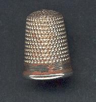 Steel thimble with added rim.Narrow plain band above rim, knurling to and over top. $ (size) on plain band.Possibly aluminum added rim.