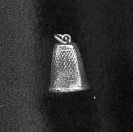 Very small thimble, probably a charm. Facetted rim, diamond shaped indentations above a plain band. No marks. Ring on top.