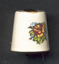 Stoneware, cream coloured thimble with a decal on side. Decal of yellow red rose with green leaves. Flat top with circular lines. Gold paper label on top reads 'Made in Taiwan Republic of China'