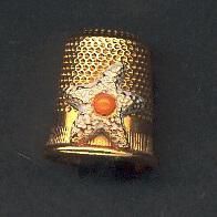Gold coloured steel(attracts magnet) thimble, with rolled rim. Narrow vertically lined band above and a narrow plain band above this. Indentations to and over top. Added starfish on side - white with coral coloured bead in center. ÒSpainÓ printed on plain band.