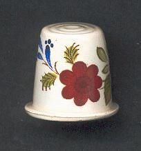 Creamy white slightly fluted, thimble with flat top with circles.Flower design on thimble . Transfer print of a red rose,red and blue other flowers and green leaves. No marks.